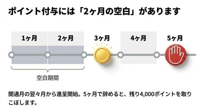 多くのユーザーは「契約した月から貰える」と思い込みがちですが、実際には開通月の翌々月から進呈が始まります。