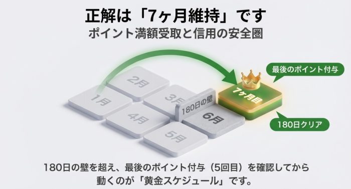 答え:ポイント満額受領とブラックリスト回避には7ヶ月維持が正解です。