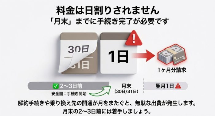 ですので、一番無駄がないのは「月末の最終日に解約が完了する」ように手続きを進めることですね。