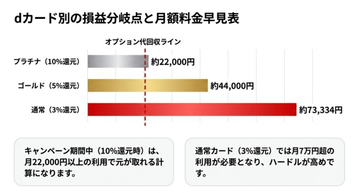 - dカード通常利用:損益分岐点が高く、多くの方には向かない