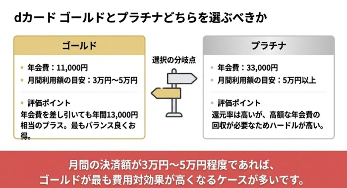 月40,000円以上のd払い・dカード利用があるなら、ポイ活オプションとdカード GOLDまたはPLATINUMの組み合わせが有力な選択肢になります。