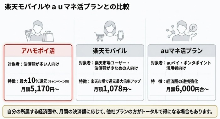 楽天経済圏をすでに活用している方や、月間決済額がそれほど多くない方には、楽天モバイルやauマネ活プランの方がトータルで得になる場合もあります。