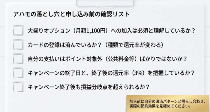 「アハモの落とし穴」として検索されているように、対象外支払いの多さや月間上限の存在は、実際の節約効果を試算する上で見落としやすいポイントです。加入前に自分の決済パターンと照らし合わせてご確認ください。