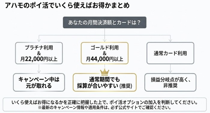 ahamoのポイ活オプションに加入するかどうかは、自分の月間決済額と照らし合わせた「損益分岐点」で判断するのが最もシンプルです。このセクションでは、カード種別ごとの具体的な数字と、注意しておきたいポイントをまとめています。