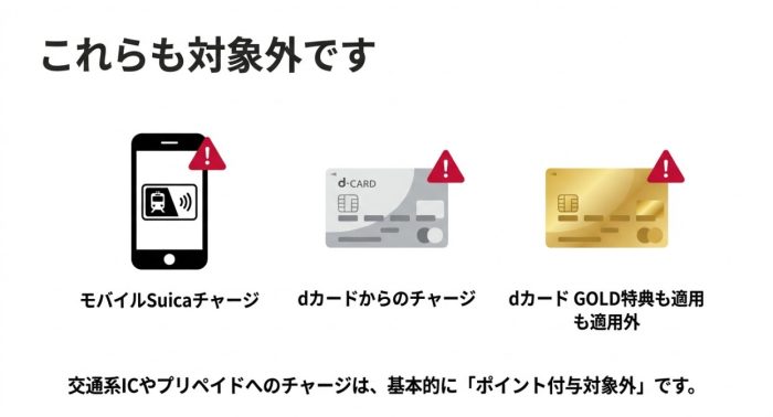 通勤や通学で毎日使うSuica(モバイルSuica)へのチャージも、ポイ活好きなら誰もが通る道ですよね。毎月の電車代やコンビニでの少額決済をSuicaに集約し、そのチャージ元をahamoのポイ活(d払い)に設定できれば、4,000ポイントの上限達成は一気に現実味を帯びてきます。しかし、残念ながらモバイルSuicaへのチャージも、規約上で明確に「ポイント進呈対象外」のリストに入っています。