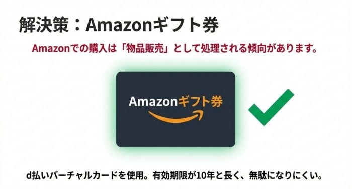 現在、多くのポイ活ユーザーが注目している唯一の希望とも言えるのが、Amazonギフト券の購入です。d払いバーチャルカードをAmazonの支払い方法に登録し、チャージタイプのギフト券を購入する方法ですね。なぜこれがJAL Payチャージと違うのかというと、Amazonでの購入は、システム上「通常の物販(お買い物)」として処理されるケースが非常に多いためです。
