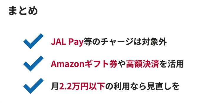 クレジットカード発行各社は、決済手数料がほとんど入らないチャージ取引に対してポイントを出すことが経営上の負担になっているようです。このため、dカードをメインに使っている方は、JAL Payへのチャージは「ポイントが付かないもの」として認識し、別の決済手段を検討するのが現実的ですね。正確な対象外リストは常に更新されるため、定期的に公式サイトの「ポイント進呈対象外一覧」をチェックすることをお忘れなく。