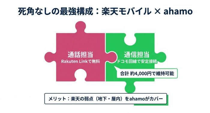 「通話は楽天モバイル、データ通信はahamo」という役割分担をすることで、通信の穴を完全に埋めることができます。