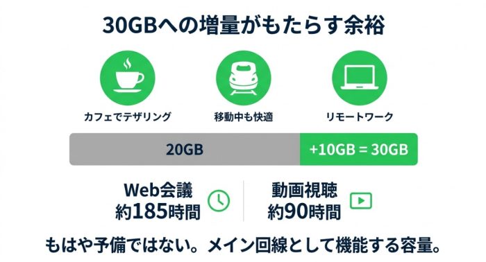 30GBもあれば、外出先のカフェや移動中の新幹線でPCを開いて作業する際も、テザリングを躊躇なく使えます。