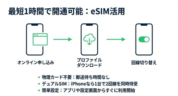 eSIMなら開通までの待ち時間も最短1時間で完了