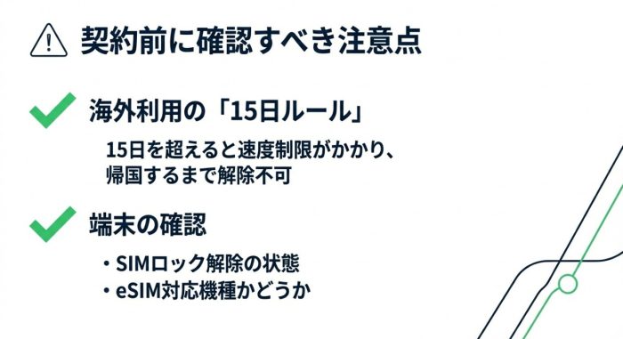海外での利用が連続15日を超えると、速度が128kbpsに制限され、これは日本に帰国するまで解除されません。