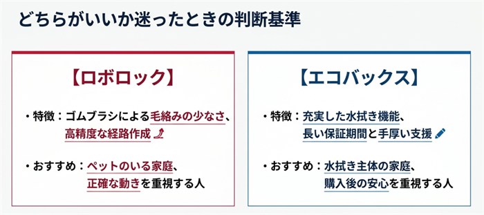 - 水拭きや保証体制を重視するならエコバックスが選ばれやすい
