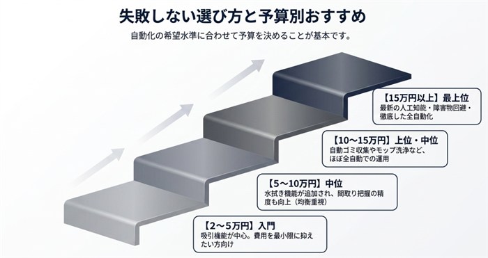 - 2〜5万円(エントリー):吸引機能が中心、SLAMナビゲーション搭載のモデルが多い。コストを抑えたい方向け。