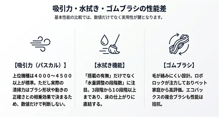 選び方のポイントから、吸引力・水拭き・ゴムブラシといった性能差、コストパフォーマンス、購入後のメンテナンス費用、保証体制まで、できる限り分かりやすく解説しています。
