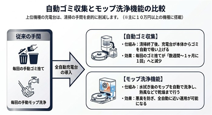 - 自動ゴミ収集・モップ洗浄などの全自動機能は10万円以上のモデルに集中している