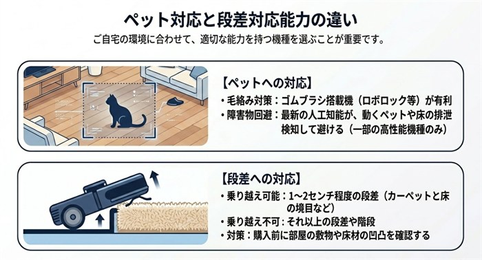 ペット対応については、ロボロックのゴムブラシが毛絡みを抑える点でアドバンテージがあると言われています。また、エコバックスのAIVI 3D 2.0などの障害物回避技術は、動くペットや落とし物を検知して回避できる機能で、床の汚れ問題(ペットの排泄物など)にも対応できる機種があります。