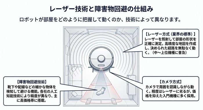 ロボット掃除機のナビゲーション方式は、主に2種類あります。