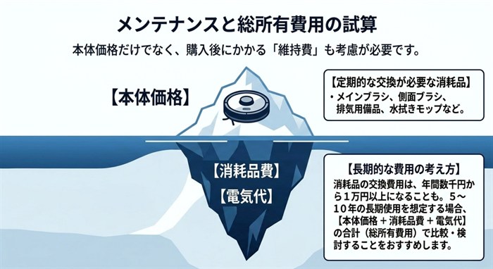 ここからは、購入判断の前提となる基礎知識と、長く使い続けるためのコスト視点をまとめます。「そもそもロボット掃除機ってどう動いているの?」という疑問から、ランニングコストまでを整理しました。