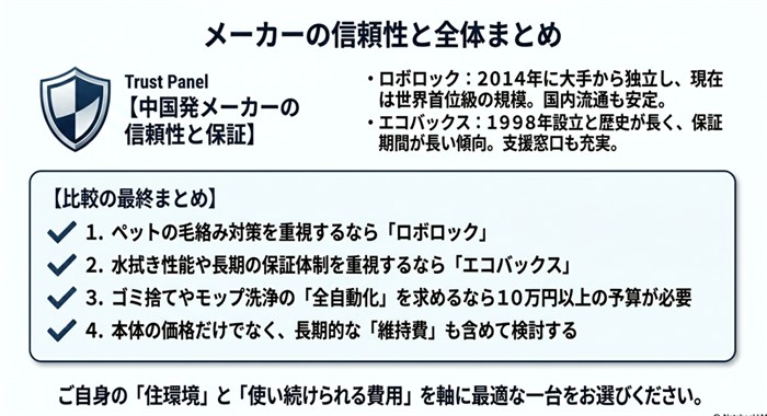 エコバックスとロボロックのロボット掃除機比較について、ここまでの内容をまとめます。