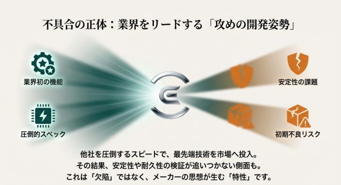 しかし、その「攻めの開発姿勢」ゆえに、安定性や耐久性のテストが十分でないままリリースされているのでは、という懸念があるのも事実ですね。