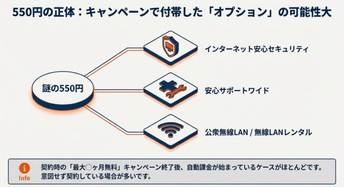 他にも、街中のWi-Fiスポットが使える「公衆無線LAN」や、 ルーターの「無線LANレンタル料」が550円の場合もあります。