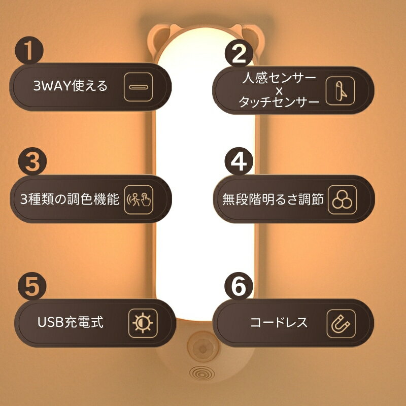 ナイトライト 人感 センサー 授乳ライト うさぎ・ネコ(USB充電)