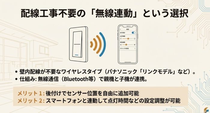 もともとある「3路配線」という仕組みを、センサー用の親機・子機配線に作り変える必要があるからです。