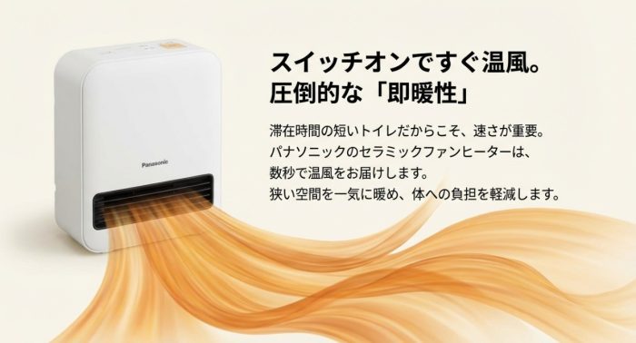 パナソニックのセラミックファンヒーターは、スイッチを入れてから数秒で温風が出るため、滞在時間の短いトイレでもすぐに暖かさを実感できます。