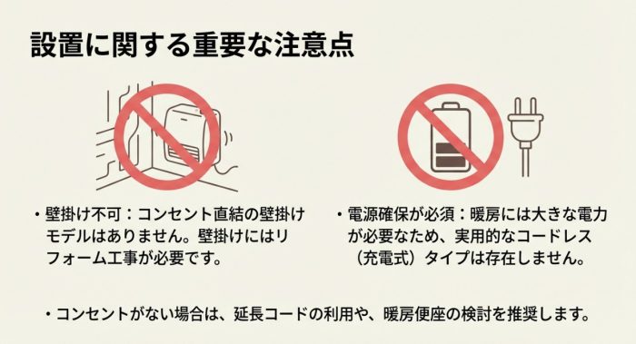 また、壁掛けができるのか、あるいはコンセントがない場所でも使えるコードレスタイプがあるのか、といった疑問を持つ方もいらっしゃるかもしれません。