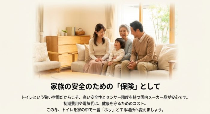 トイレ暖房を導入することは、単なる寒さ対策ではなく、「家族の命を守るための安全装置」と言えるかもしれません。