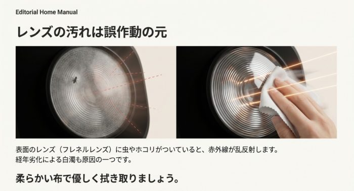 レンズが汚れていると赤外線が乱反射してしまい、動作が不安定になる原因になります。