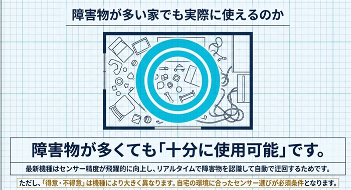 障害物が多い環境でも使いやすい機種を選ぶためのポイントは、このページの後半「家の間取りと障害物環境で機種を選ぶ方法」で整理しています。