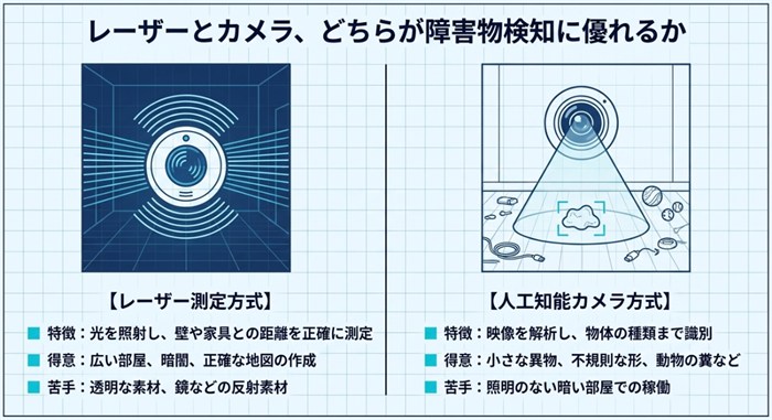 ロボット掃除機の障害物検知を語るとき、必ず登場するのがLiDAR(レーザーセンサー)とカメラ(AIカメラ認識)の比較です。