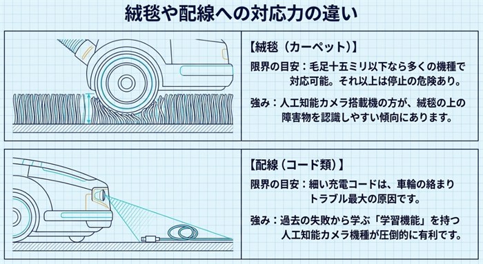 カーペットやケーブルへの対応力の違い