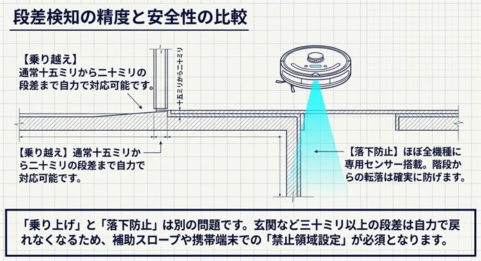 機種によって検知できる段差の高さに違いがあり、一般的には15〜20mm程度の段差であれば多くの機種が対応しています。