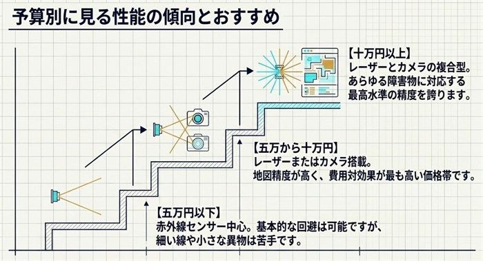 | 5〜10万円 | LiDARまたはAIカメラ搭載 | マッピング精度が高く、ルート最適化が速い。動作テストでの成功率も向上 |