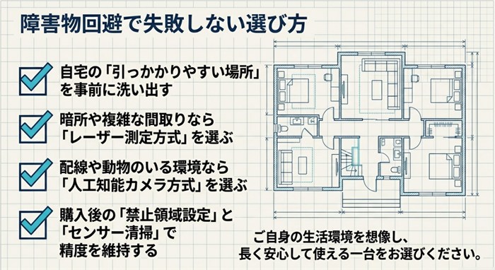 ロボット掃除機の障害物回避能力は、機種選びと購入後の運用の両方で決まります。