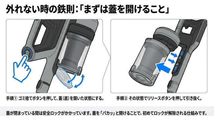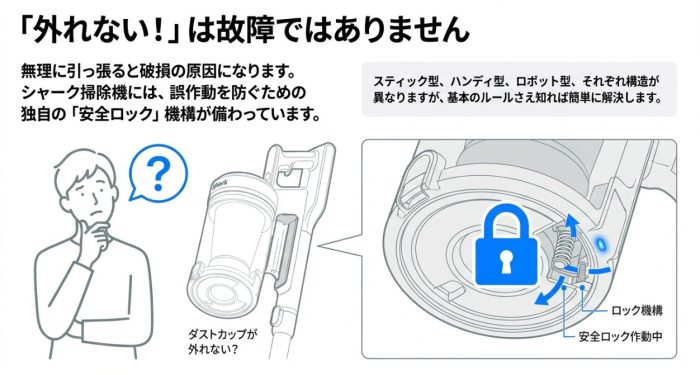 シャークの掃除機は、実は「安全のために、この状態じゃないと外れない」という独自の仕組みがあるんです。まずは基本の考え方から見ていきましょう。