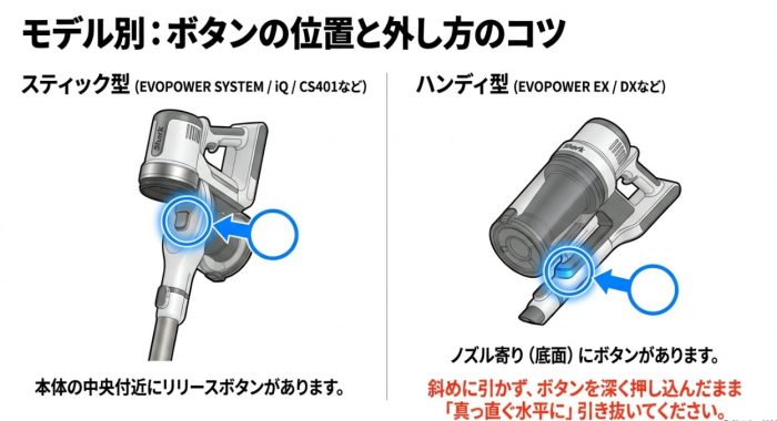 EVOPOWER SYSTEMやCS401、最新のCleanSense iQなど、シリーズごとの外し方のコツを知っておくと、毎日の掃除がぐっと楽になります。