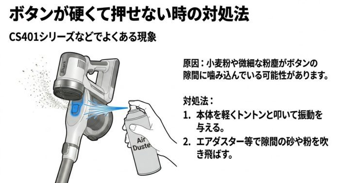 特に小麦粉のような細かいゴミを吸った後は、ボタンの可動域に砂のような抵抗が出ることがあります。