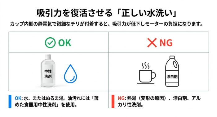 無事にカップが外せたら、次はお手入れの本番です。清潔に保つためのルールをチェックしましょう。