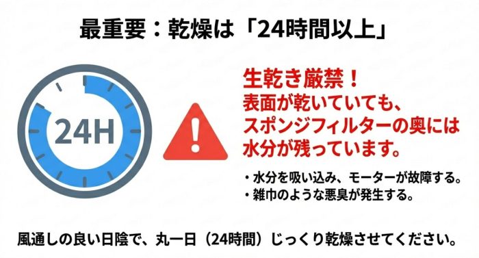 • 故障や臭いを防ぐための24時間乾燥の重要性