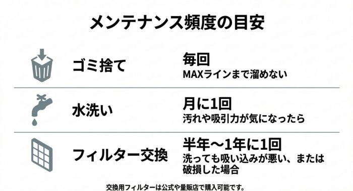 フィルター交換半年〜1年吸引力が落ちたら検討
