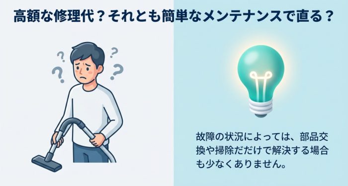 まず、高額な修理を依頼する前に、フィルターの掃除やバッテリーの交換を検討してみることが、最も安く済ませるコツです。