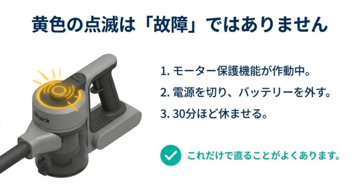 シャークの掃除機でよくあるのが、LEDライトが「黄色に点滅」する症状です。