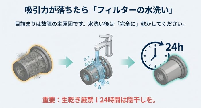 特にフィルターがホコリで目詰まりしていると、空気の通り道がなくなって吸引力が劇的に落ちてしまいます。