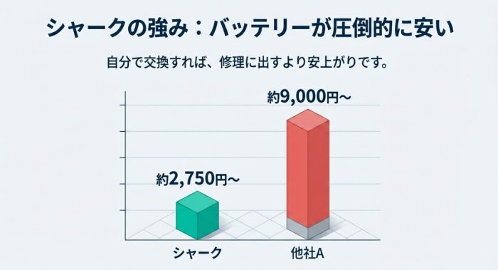 でも安心してください。シャークの凄いところは、純正バッテリーが約3,000円弱と、他社に比べて圧倒的に安い点です。