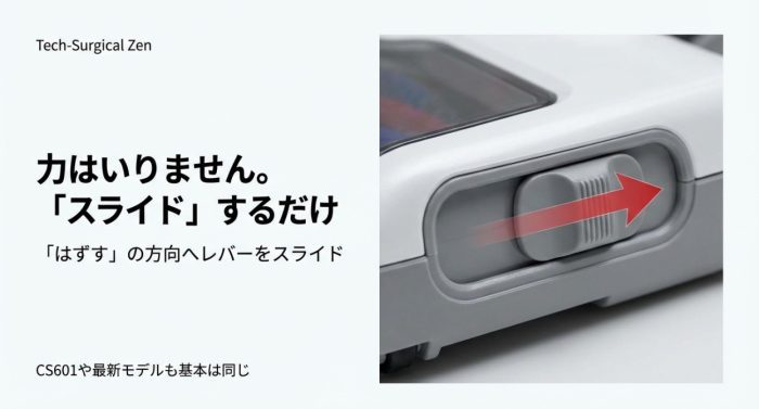 CS601などのモデルでは、工具を使わずにローラーを外せる「スライドレバー方式」が採用されています。