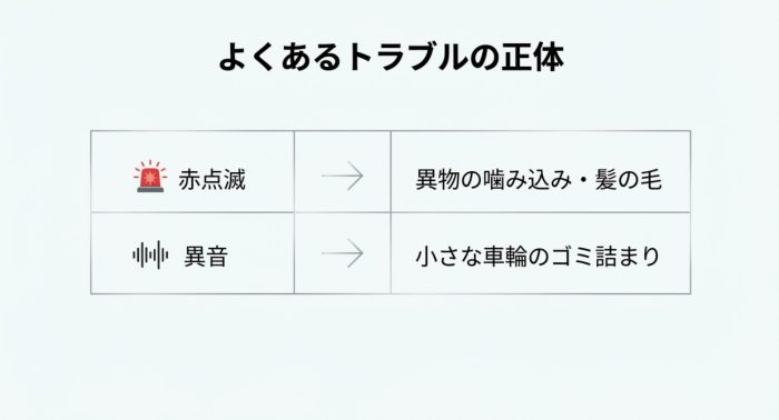 掃除中にヘッドのランプが赤く点滅して止まってしまったら、それは「ブラシが回れないよ!」というSOSサインです。