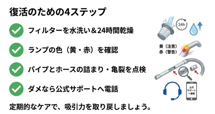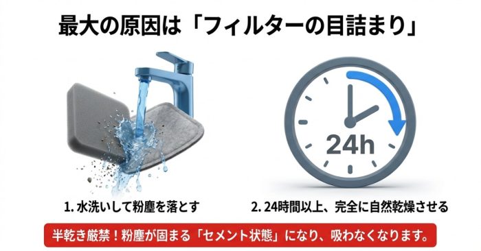フィルター掃除と24時間以上の完全乾燥で吸引力回復